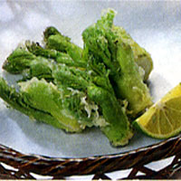 1. たらの芽は、木の皮の部分をとり、さっと荒い水気を十分ふき取る。